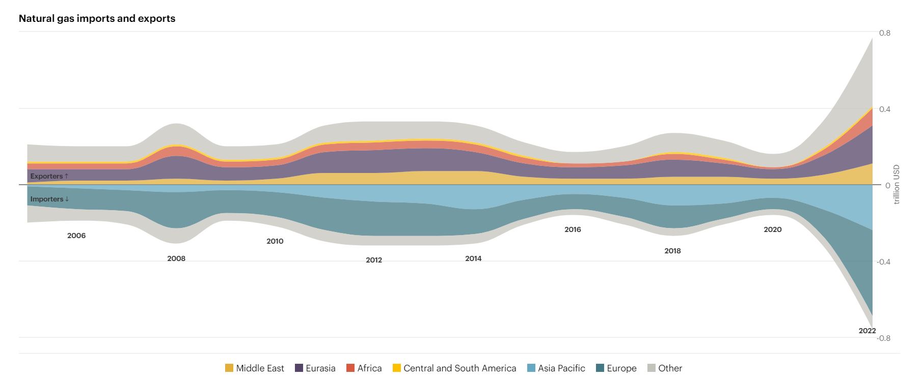 Figura 2. Import e Export di Gas naturale per regione. Fonte: IEA