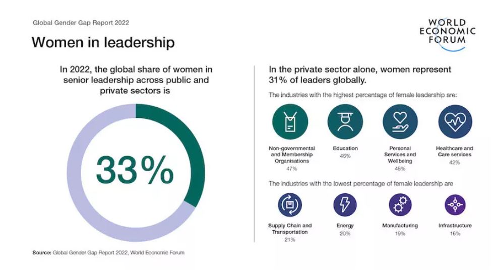 Il Global Gender Gap Index 2022 offre un’istantanea della rappresentanza femminile in ruoli di leadership, in base ai diversi settori. I dati mostrano che solo alcuni hanno livelli vicini alla parità di genere, come le organizzazioni non governative e associative (47%), l’istruzione (46%), i servizi alla persona e il wellness (45%). All’estremità opposta si collocano i settori dell’energia (20%), della produzione (19%) e delle infrastrutture (16%).