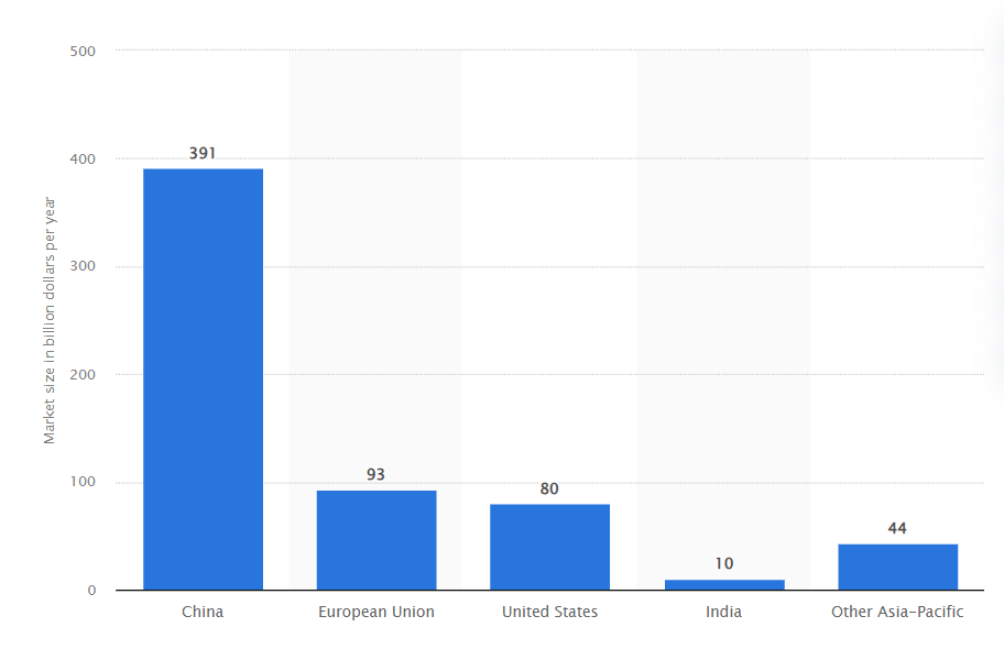 Figura 1. Dimensione del mercato delle principali tecnologie energetiche pulite in tutto il mondo nell’ambito dello scenario degli impegni annunciati entro il 2030, per paese (in milioni di dollari per anno). Fonte: Statista 2024.