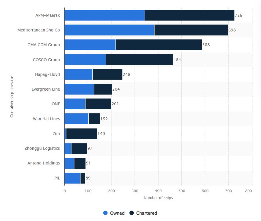 Figure 1. I principali operatori di navi portacontainer al 30 settembre 2022, in base al numero di navi di proprietà e noleggiate. Fonte: Statista